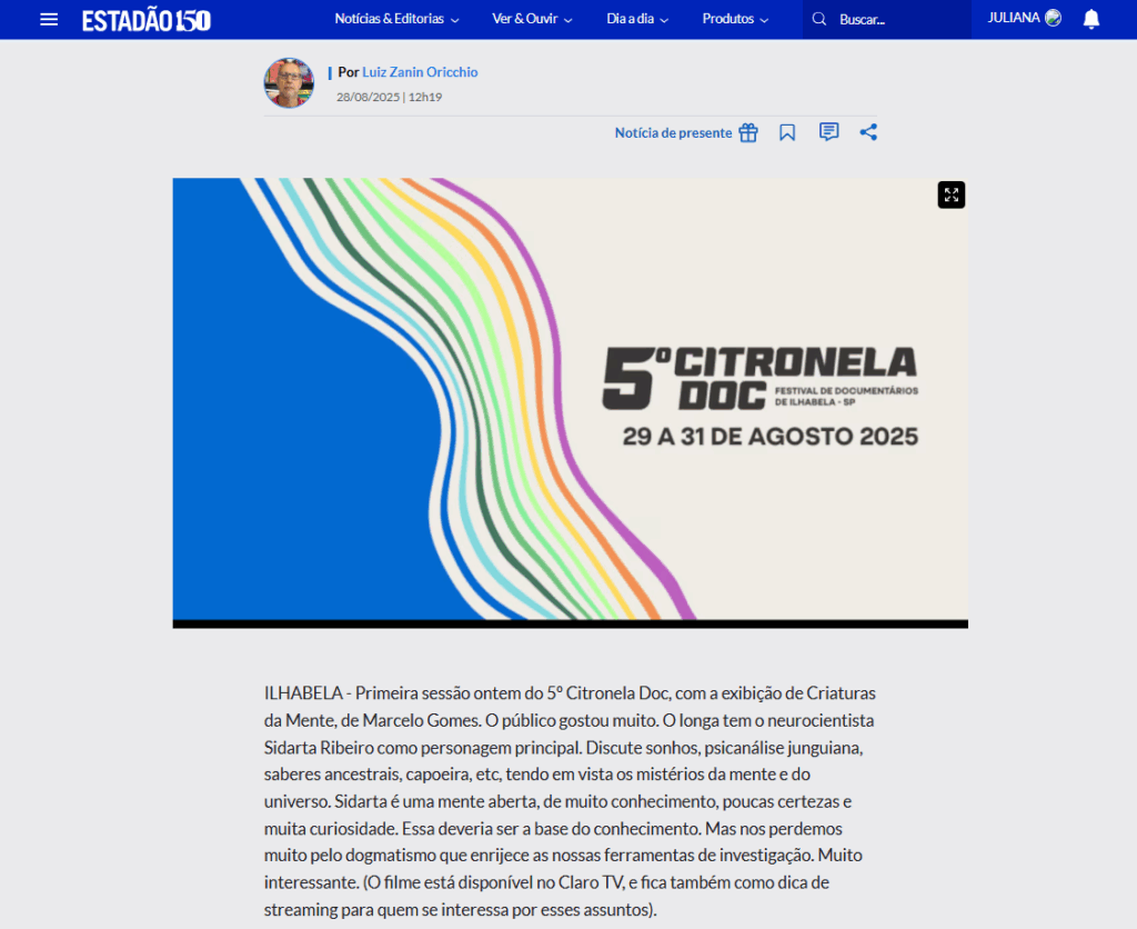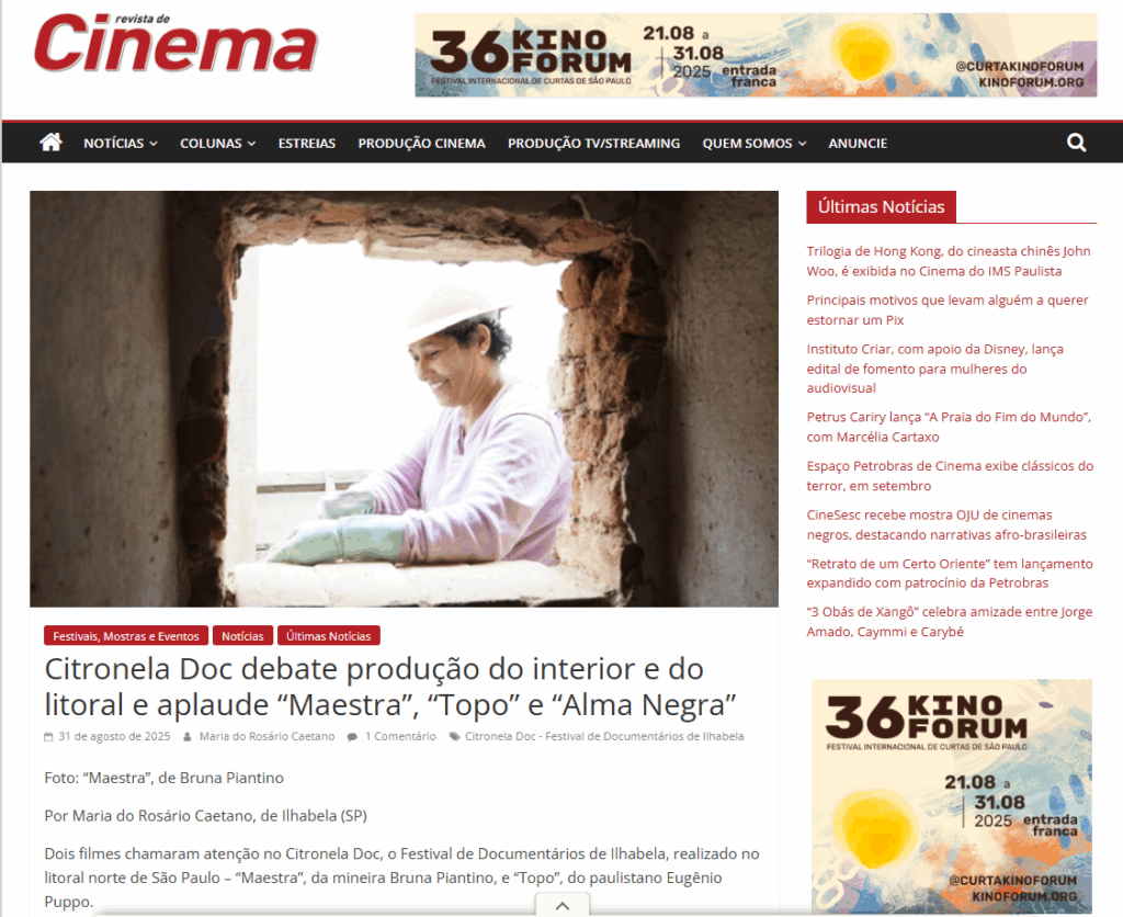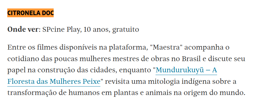 Nota na coluna Multitela, da Folha de São Paulo, destacou os filmes "Maestra" e "Mundurukuyu - A Floresta das Mulheres Peixe", que estão na mostra online do Citronela Doc na Spcine Play, até o dia 10 de setembro.